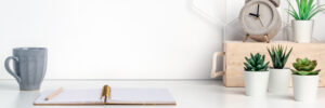 Creative hipster’s desk at a white wall. A natural space for drawing and work. Succulents, a concrete alarm clock, a cup of coffee, an open notebook. Panoramic copy space for text